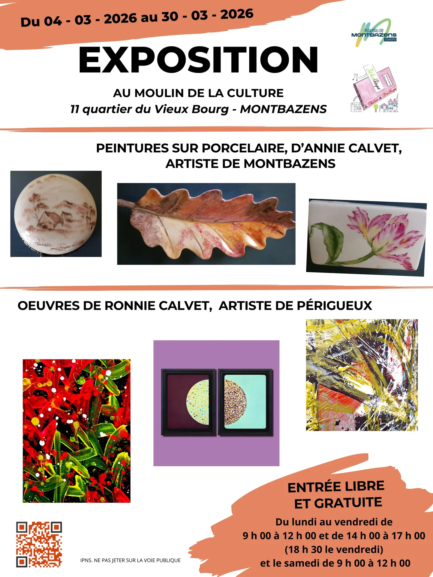 Exposition de peintures de Marc GEROME et des sculptures de Raymond LACOSTE, artistes de Vaureilles. A découvrir au moulin de la culture du lundi au vendredi de 9 h 00 à 12 h 00 et de 14 h 00 à 17 h 00 (jusqu’à 18 h 30 le vendredi) et le samedi de 9 h 00 à 12 h 00.
